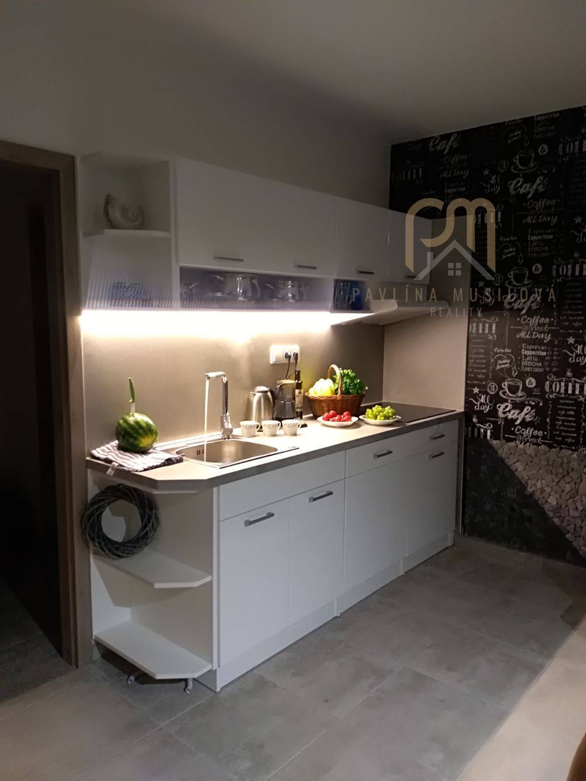 V obývací místnosti krbová kamna. Plně vybavená kuchyň s varnou deskou, troubou, odsavačem par, lednicí.